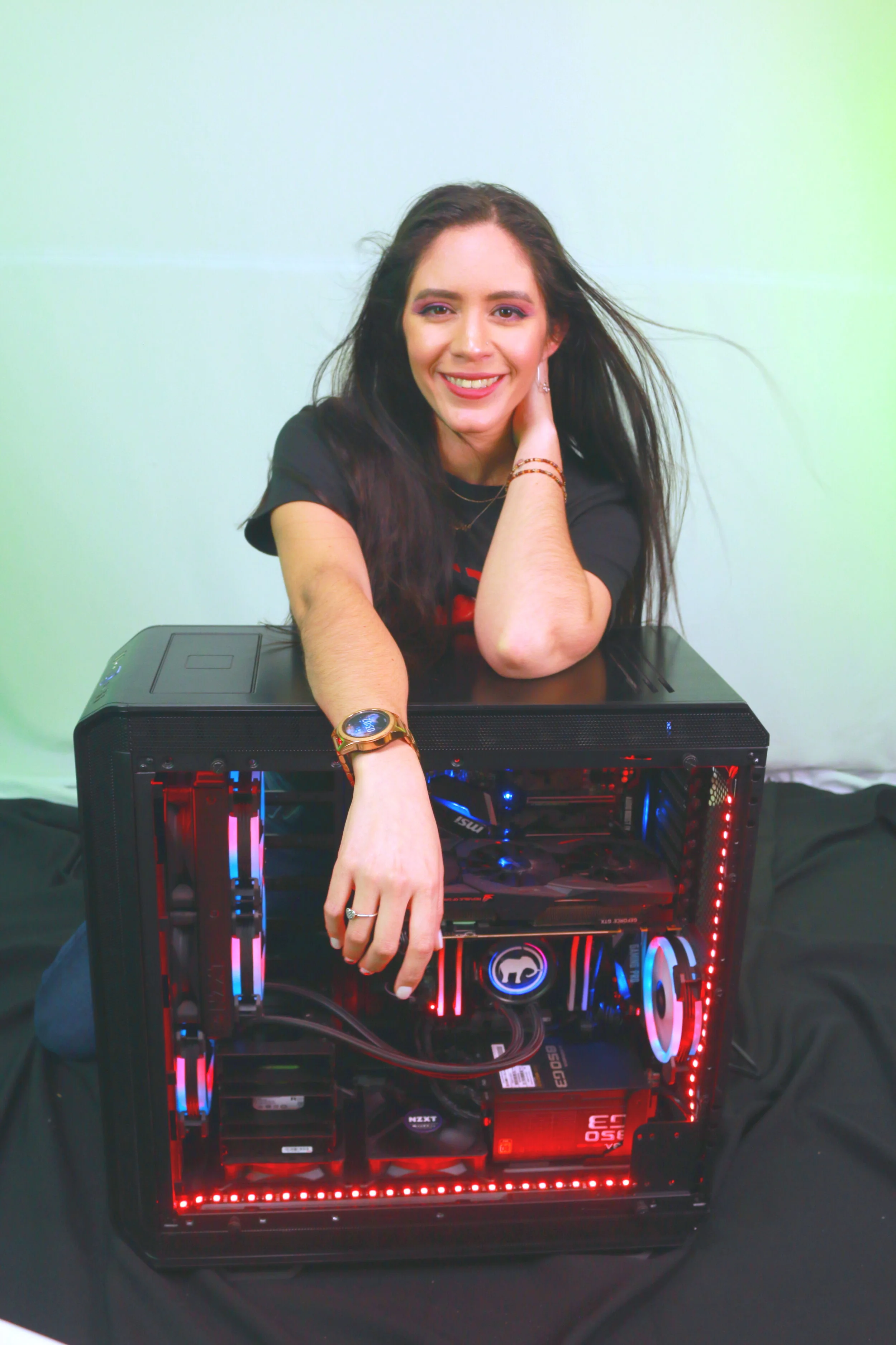 Final design. Kimberly Wolf model’s Red Rooster’s water cooled PC.